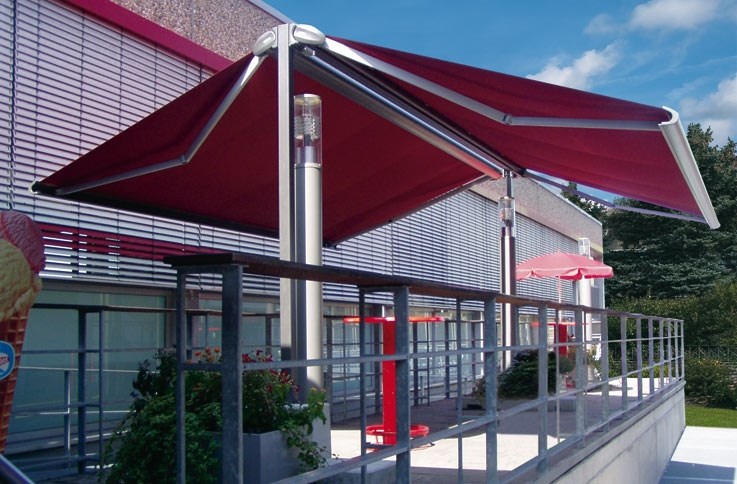 Markisestellet kan også anvendes ved koblede markiser med antal stolper efter ønske. Den maksimale afstand mellem stolperne er 6,5 m.
